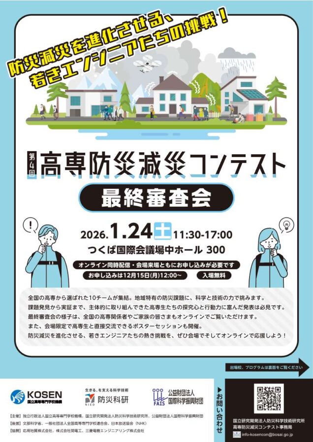 | 主催 | 独立行政法人国立高等専門学校機構、国立研究開発法人防災科学技術研究所、公益財団法人国際科学振興財団 |